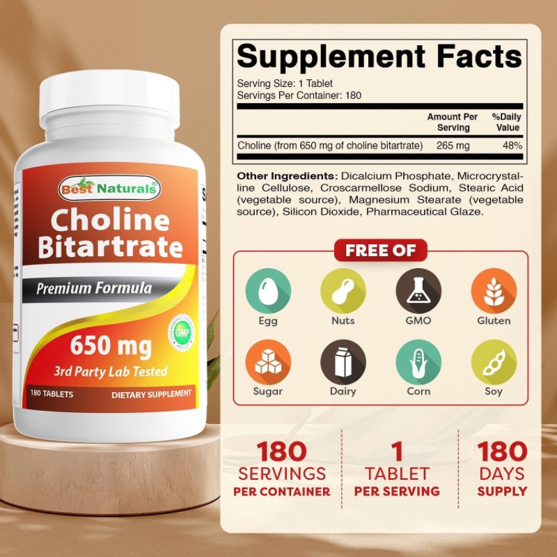 🔹 თითო ტაბლეტი შეიცავს 650 მგ ქოლინ ბიტარტრატს (265 მგ ელემენტარული ქოლინი)